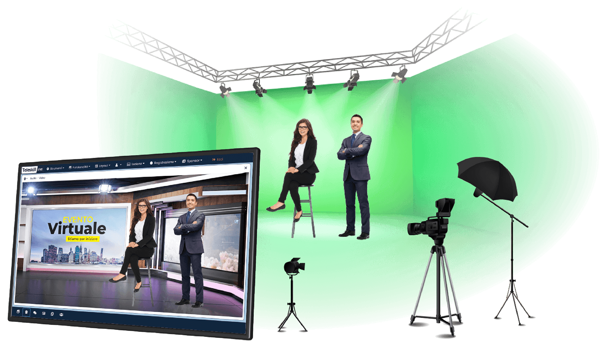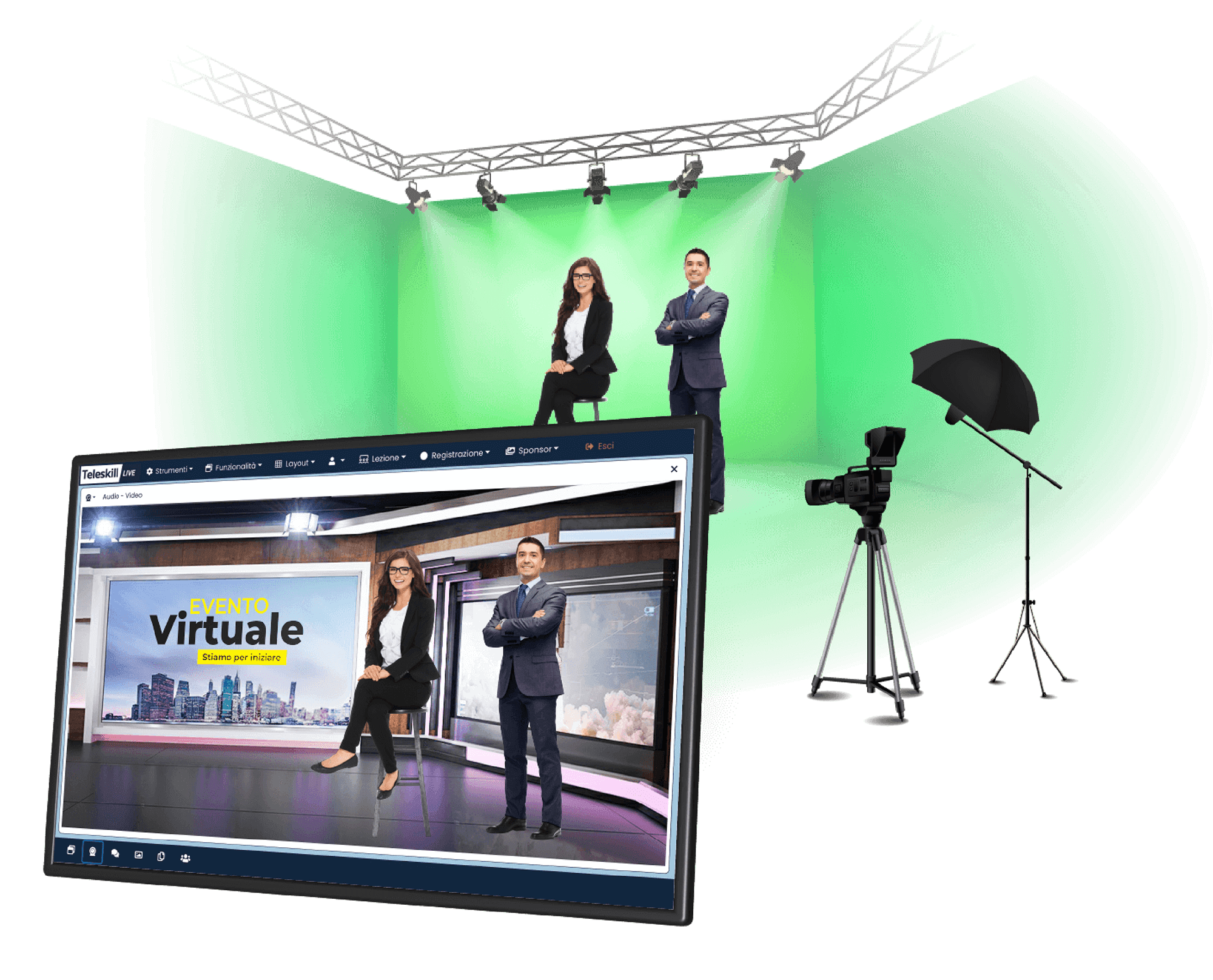 Rendi spettacolari i tuoi eventi virtuali e le tue produzioni multimediali: personalizza gli ambienti, muoviti dentro la scenografia e realizza eventi digitali con tecnologia green screen.