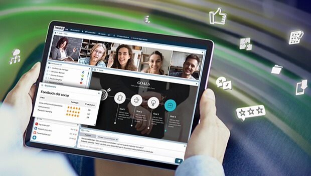 Here, too, the creation of an extended classroom allows to closely mimic what would happen in a physical class. Moreover, it offers advanced interaction and sharing tools for a seamless blend with the students’ current habits. The software, therefore, should be equipped with more performing tools, specific for distance learning, which go beyond chat, forum, raised hand, show your status (I agree, I disagree, ask to intervene in audio/video).